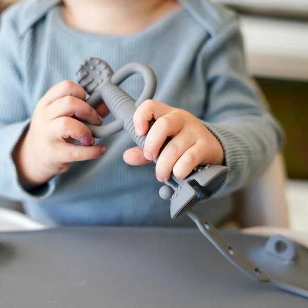 The easy attach Busy Baby Toy Strap (not included) safely and easily connects into the end of the spoon allowing it to be connected to the Busy Baby Placemat itself. This silicone ball-and-socket engineering helps to always keep this teether and training spoon within an arms reach of your growing child.