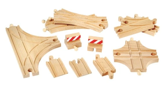 Expand the BRIO wooden railway system in all new directions with this multi functional pack of switches and accessories.