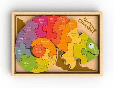 Our colorful chameleon is bilingual! This puzzle teaches numbers 1 to 15 on one side and spells out the number names in both English and Spanish on the reverse. Each chunky, double-sided piece fits sequentially for a rainbow of counting fun. Made from sustainably harvested rubber wood with non-toxic, child safe stains, the puzzle includes a 7″x10″ wood tray for storage and display. Recommended for ages 3+.