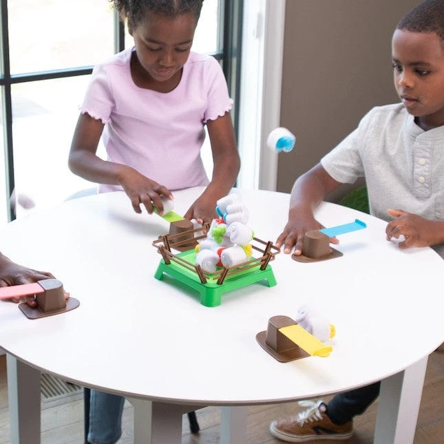 Each sheep is covered with hook and loop fabric. Plan your approach, aim right, then – Land them, stick them, and pile ’em up!
