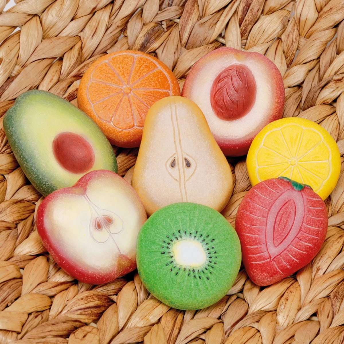 Fresh from the mud kitchen or outdoor area comes fruit salad, poached fruit, cobbler and pies. Children will find all sorts of ways to prepare and serve these delightful tactile stones for all-year-round dining! The set includes eight colorful fruits: apple, pear, peach, strawberry, avocado, kiwi, orange and lemon.
