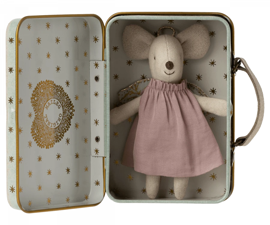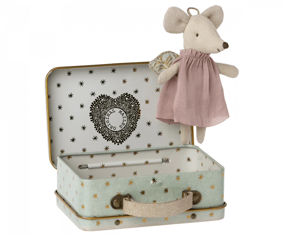 Guardian angels do their best to protect and watch over the little ones. This guardian angel comes in a mint colored metal suitcase.