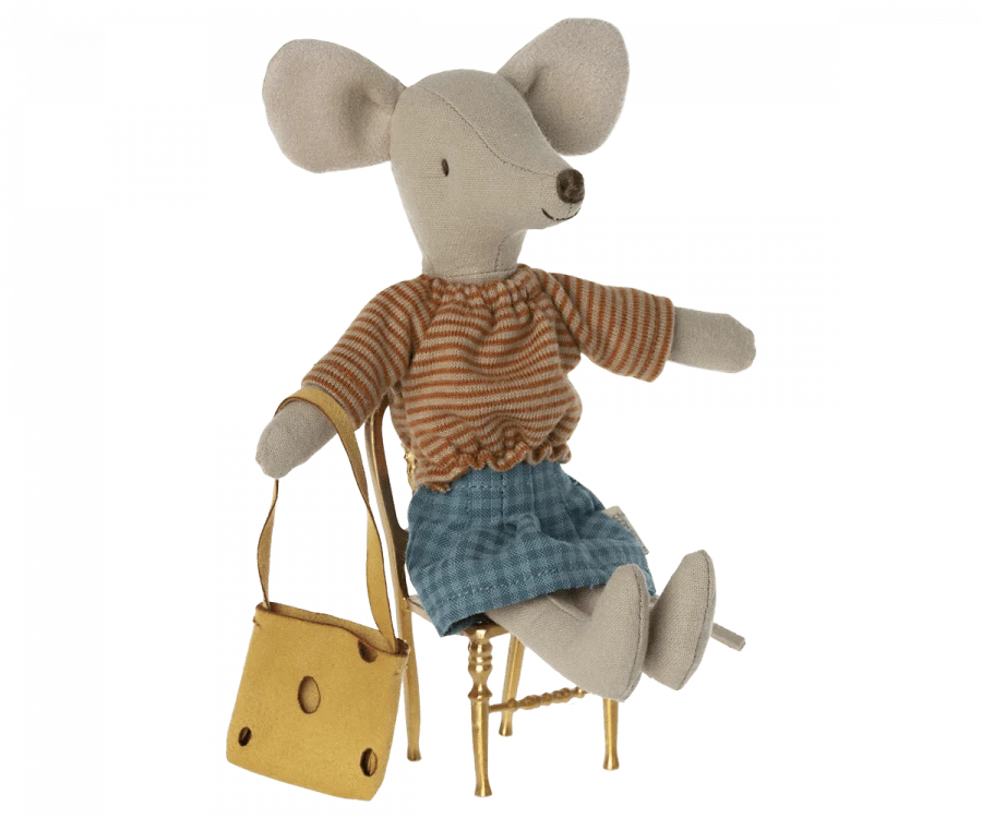 A classic Maileg item; Mum mouse, now in new clothes. This mouse fits furniture and accessories in size mouse. Buy more clothes separately, clothes in size mum/dad fit this mouse.