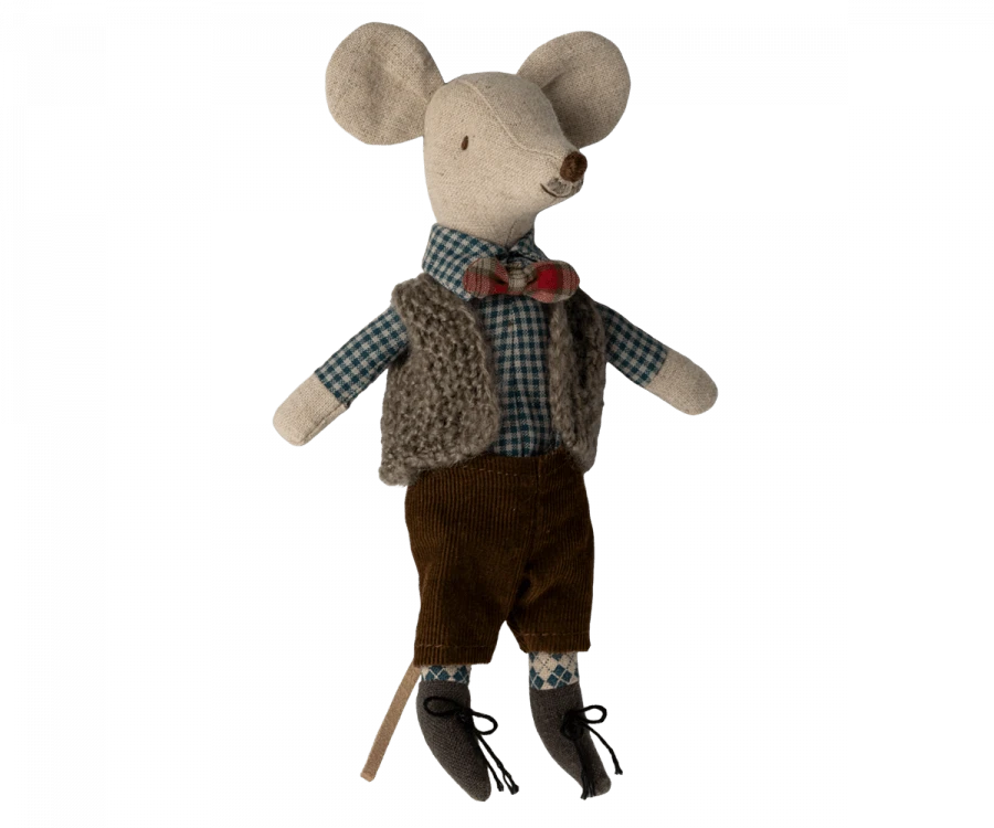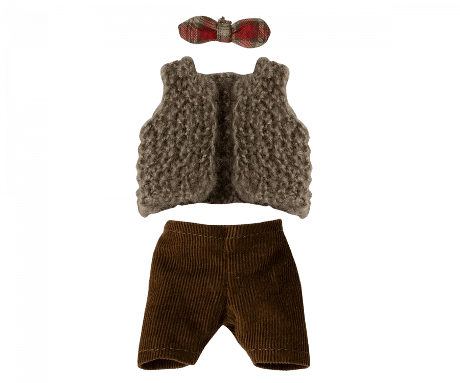 Dress up grandpa mouse in this classic set of loose clothes. It includes a pair of pants, a butterfly and a soft knitted vest.
