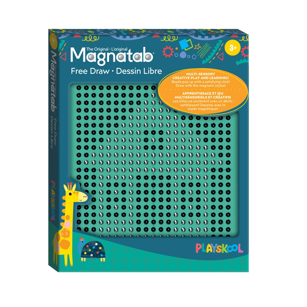 The Original Magnatab was designed with the Montessori learning style in mind, creating a sensory-based creative play experience. Using the magnetic stylus, children pull the beads up to the surface to draw pictures, letters, numbers and shapes. In doing this, they feel the pull of the magnets, hear their clicking sound, and see what they are drawing. The beads are magically “erased” when pushed down by the tip of a finger or the swipe of the side of the stylus. The tablet features easy storage for the magnetic stylus, which clicks securely into place. Great for use at home or in the classroom!