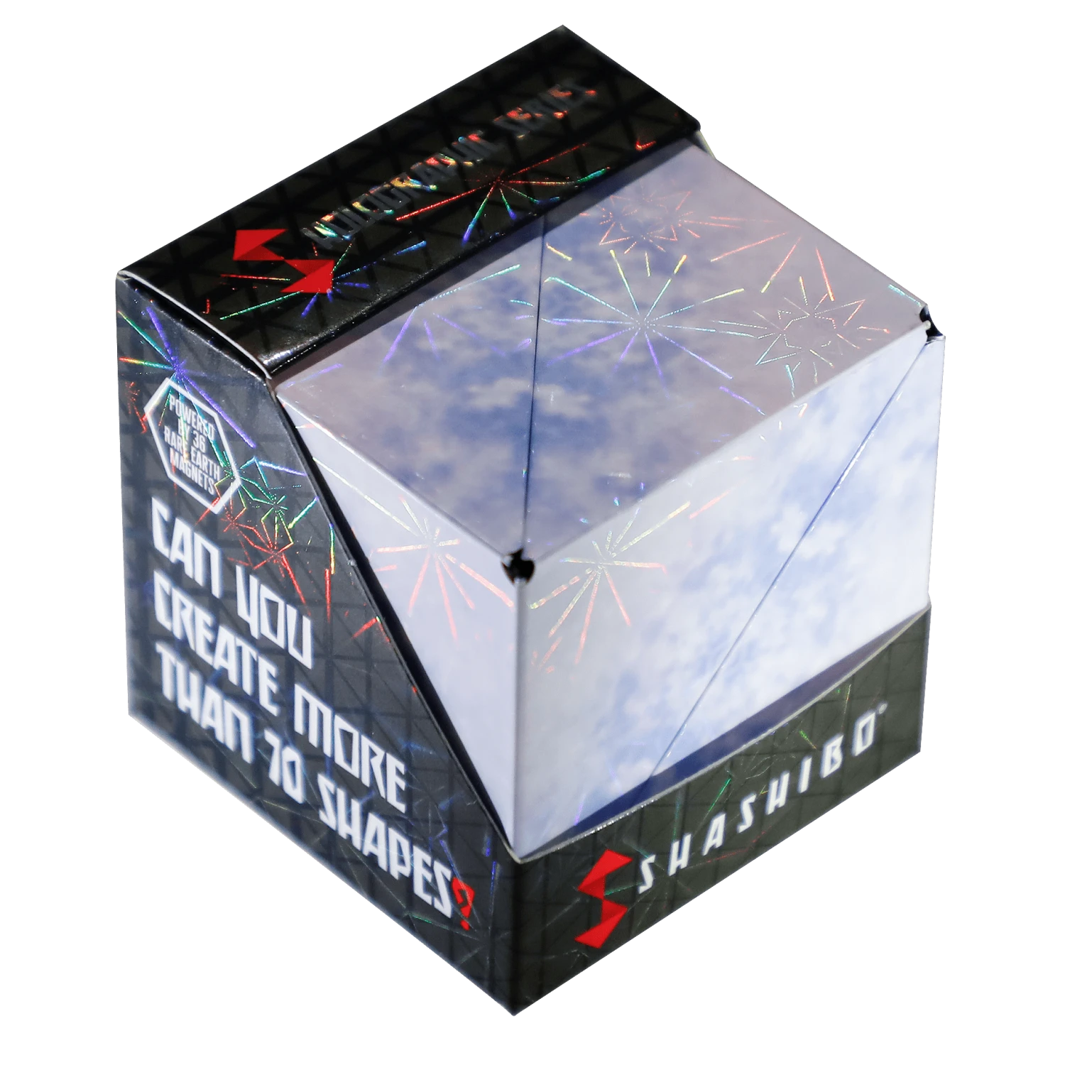 Unlock the mystery of Shashibo! Each Shashibo is powered by 36 rare earth magnets. 1 cube transforms into over 70 shapes. Combine 2 or more Shashibos to build larger shapes and create more possibilities. Can you master the shape shifting box?